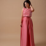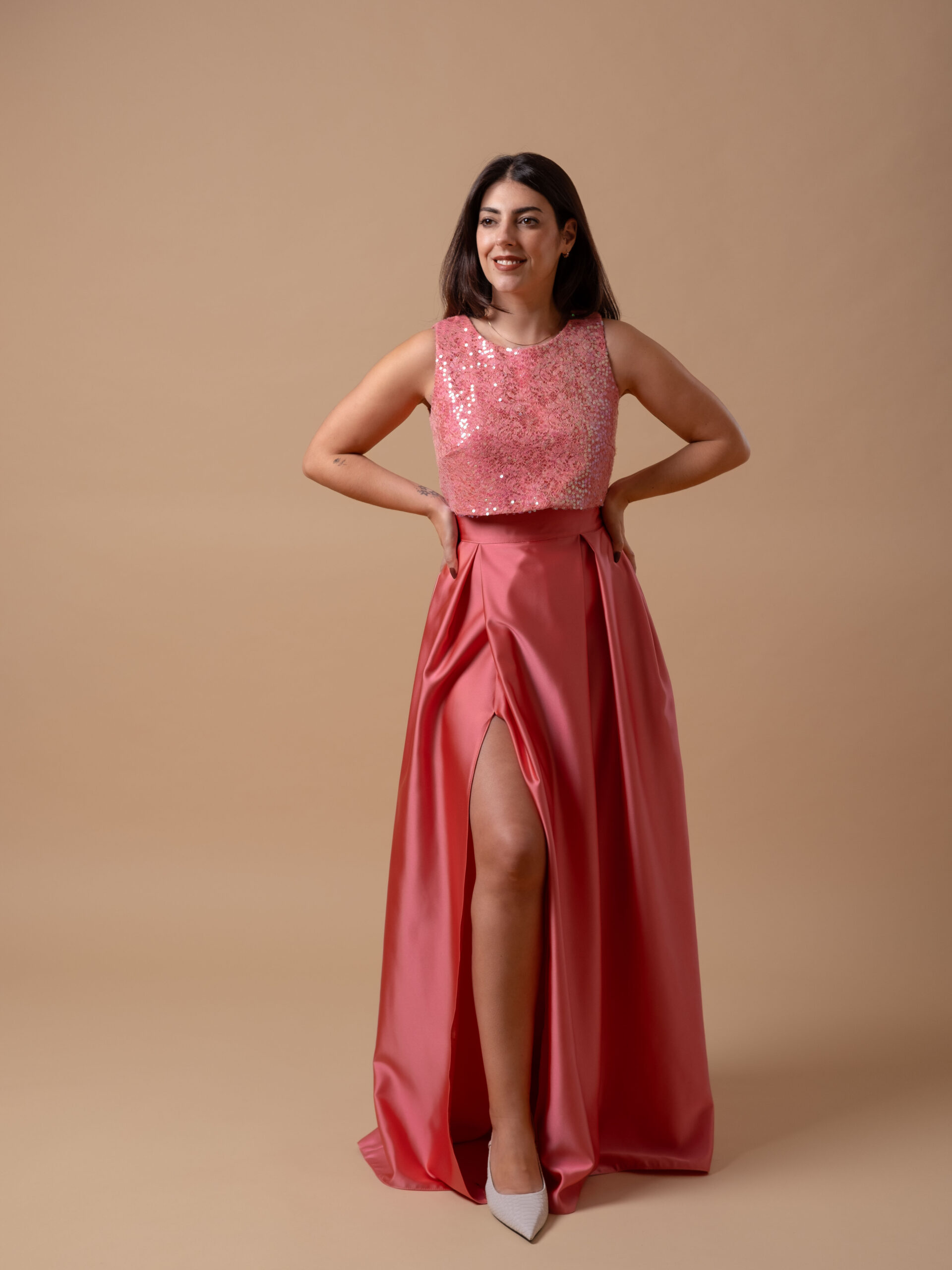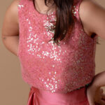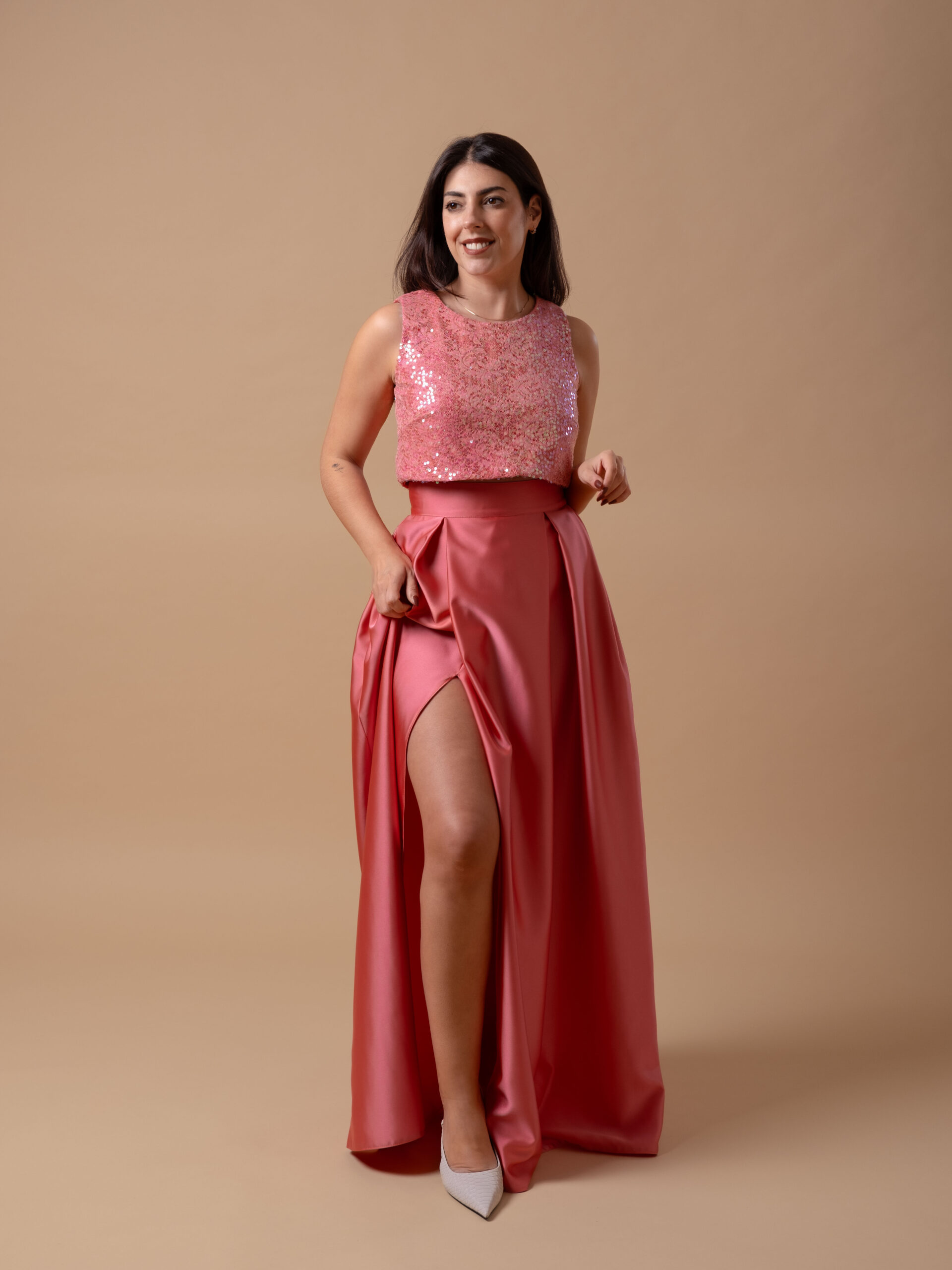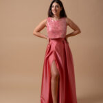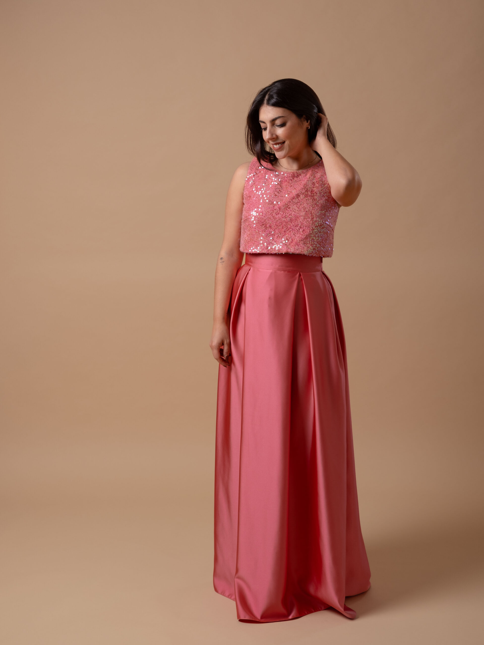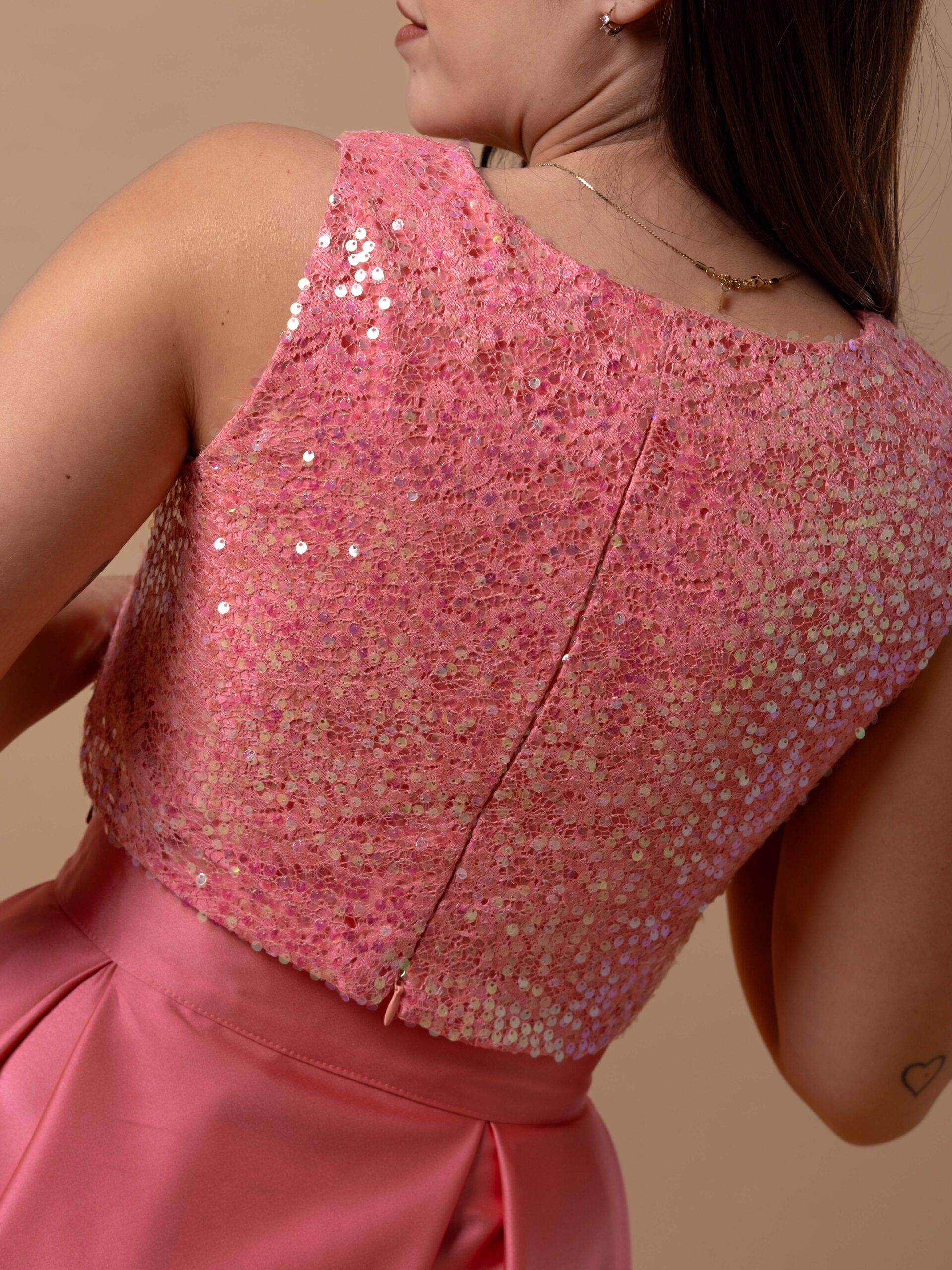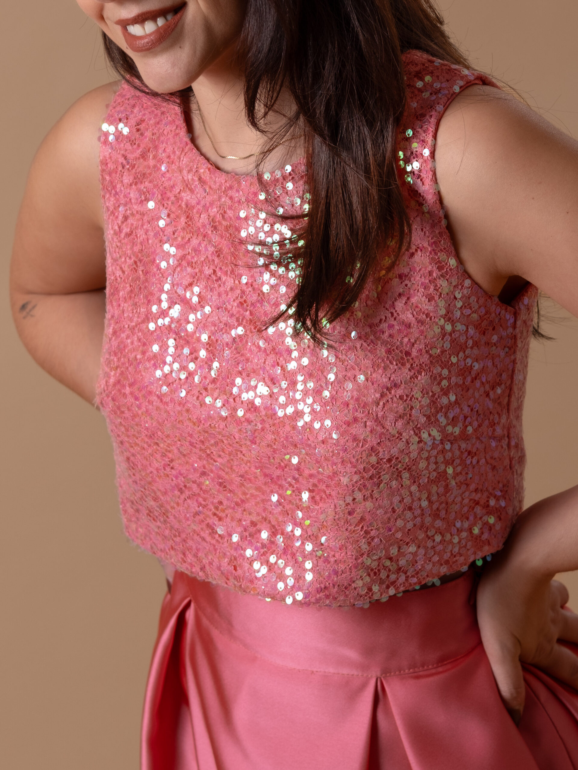 O top rendado com lantejoulas é forrado com o mesmo tecido da saia, para manter a cor e combinar de forma perfeita, sem comprometer o estilo. As lantejoulas adicionam um toque de glamour, enquanto a renda garante liberdade de movimento e conforto durante todo o dia ou noite.