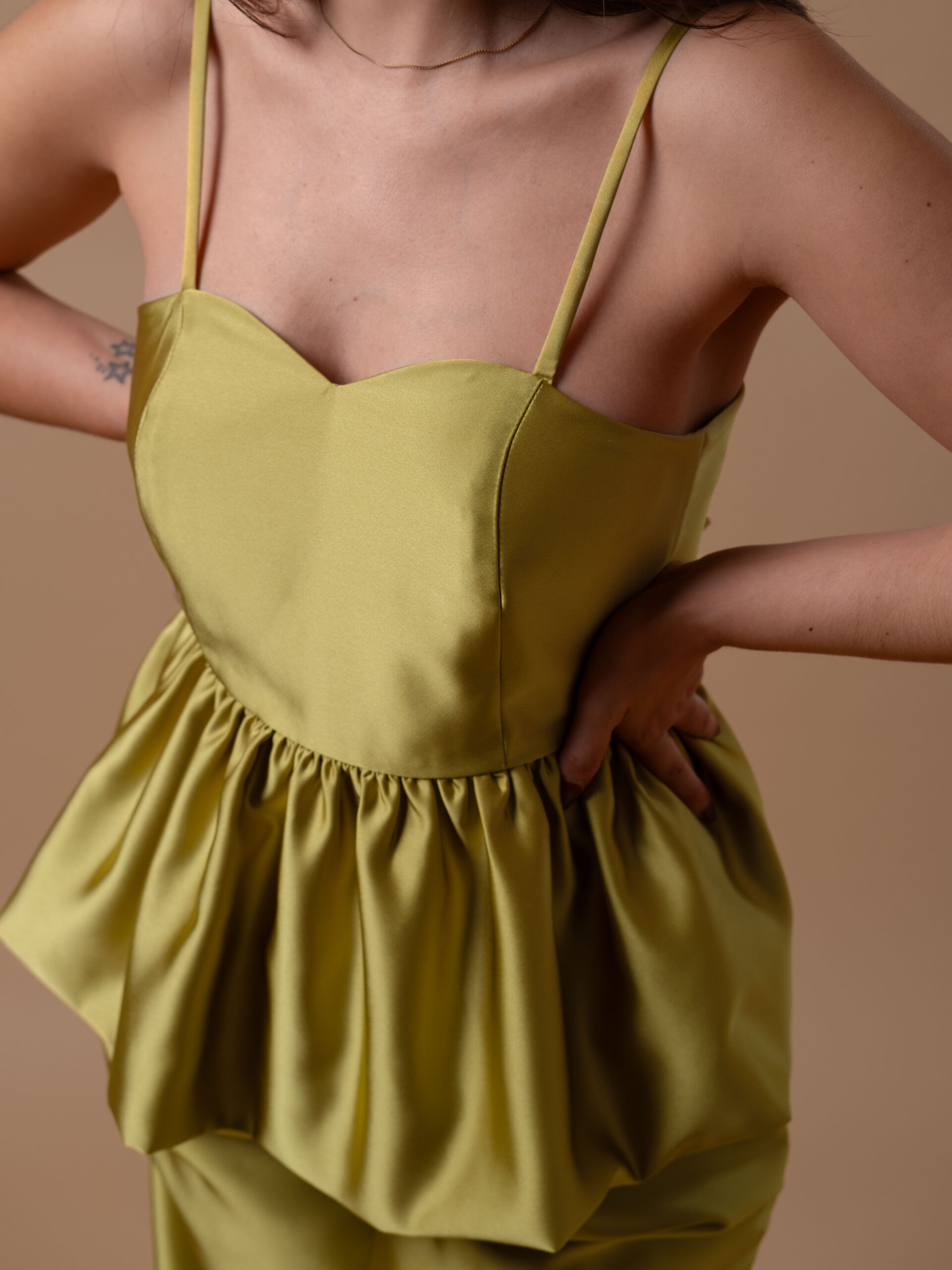 Este top corpete é forrado com o próprio tecido, garantindo uma experiência confortável e uma silhueta sofisticada. O seu design ajustável, com tiras cruzadas nas costas, permite que personalize o caimento conforme a sua preferência, garantindo tanto suporte quanto originalidade.