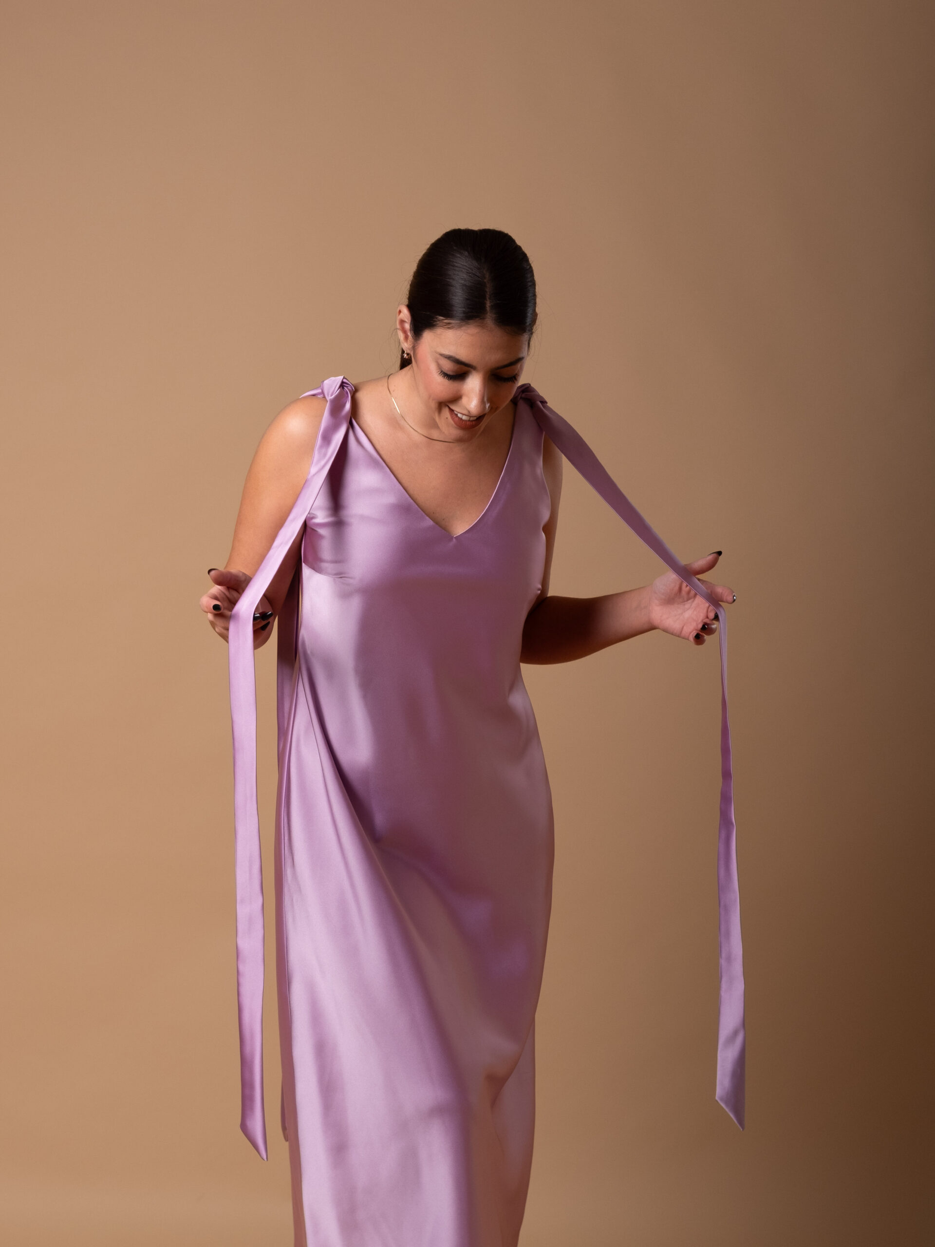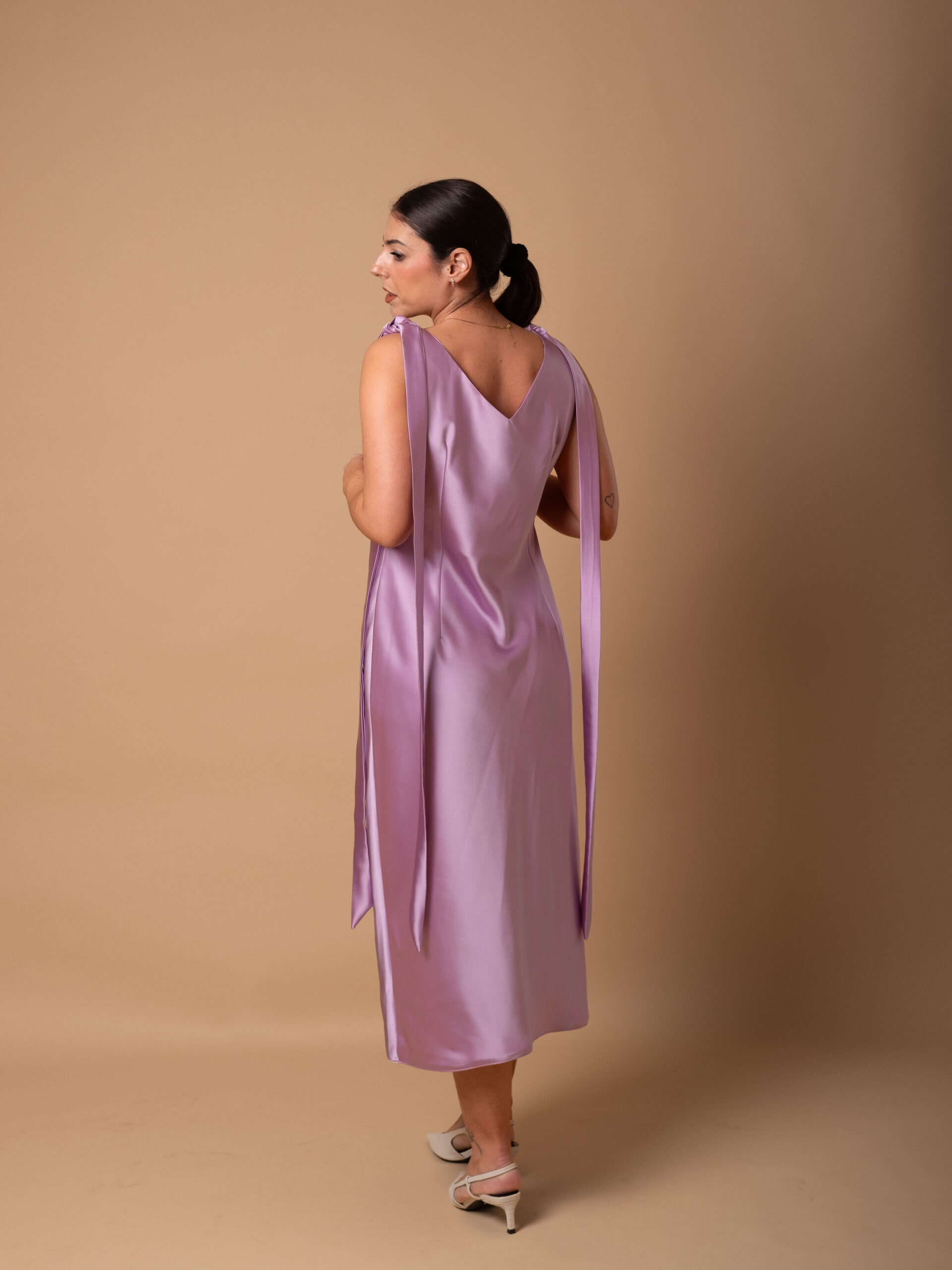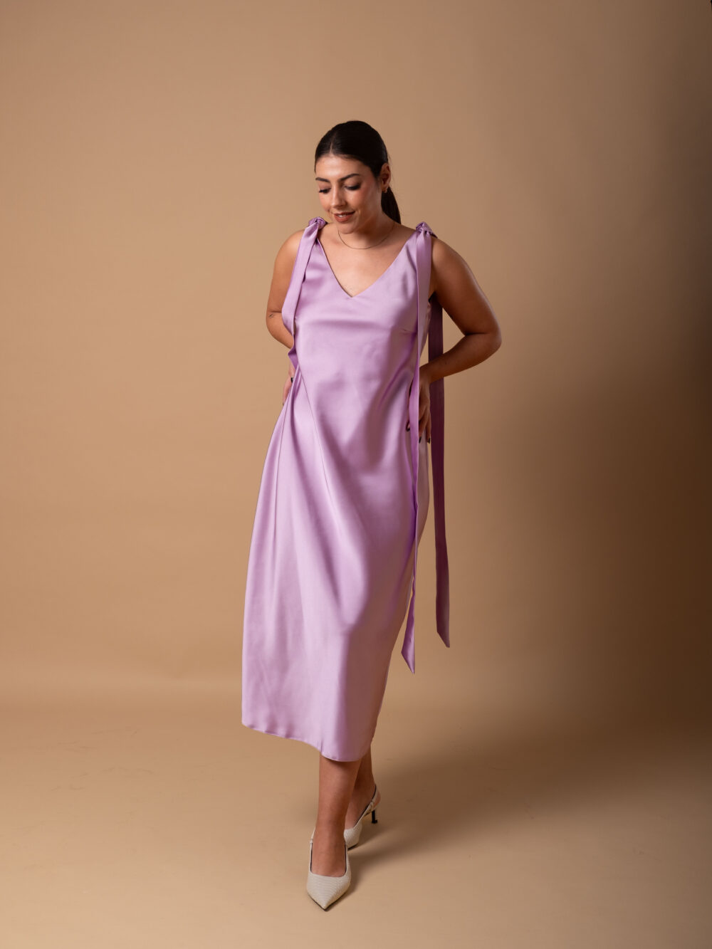 O Vestido Carmen é a definição de elegância discreta e feminina. Confeccionado num tecido acetinado de toque suave e brilho subtil, este vestido midi em tom lavanda destaca-se pela sua fluidez natural e pelo cair leve que acompanha o movimento do corpo com sofisticação.