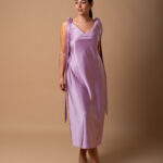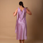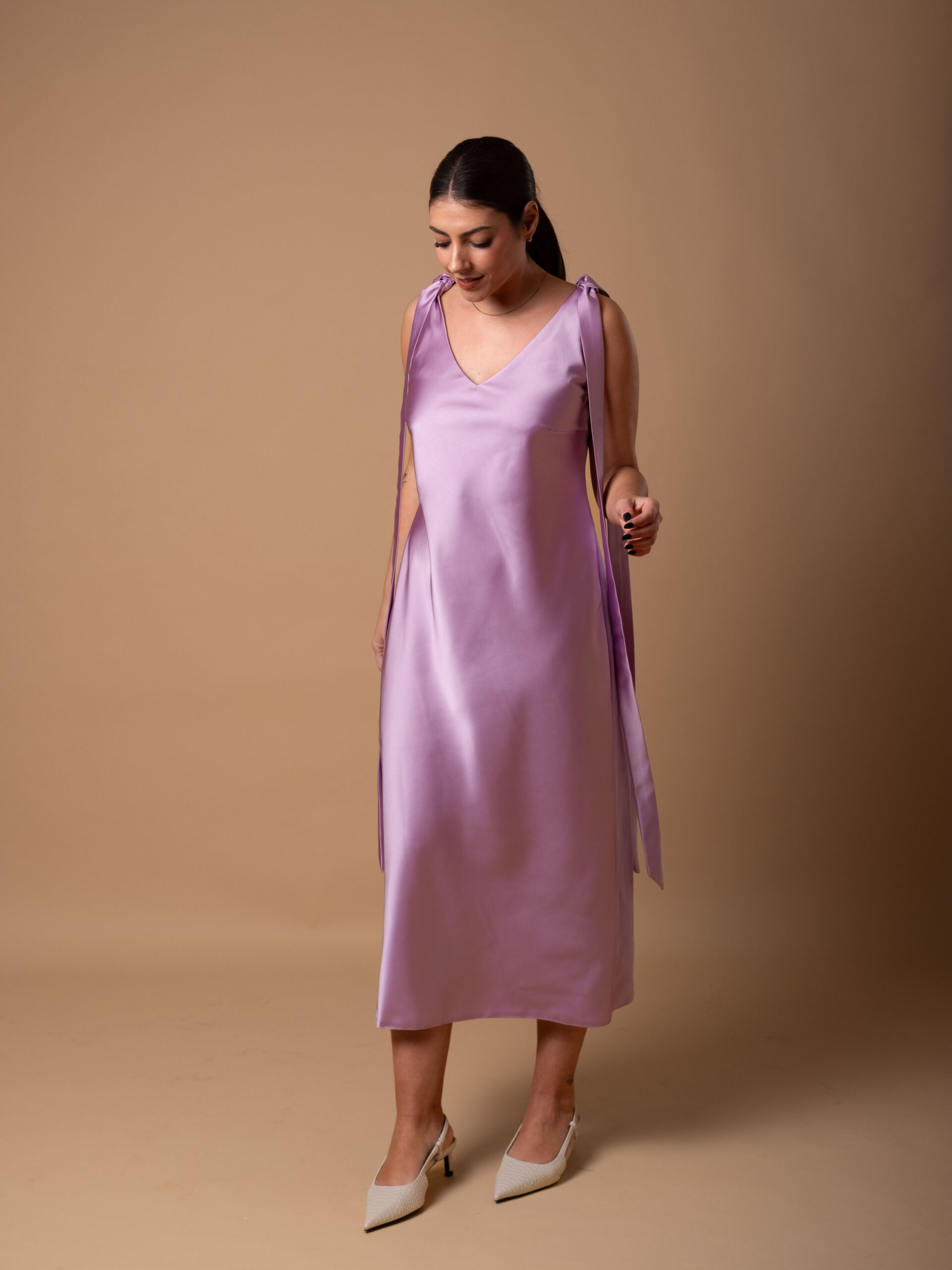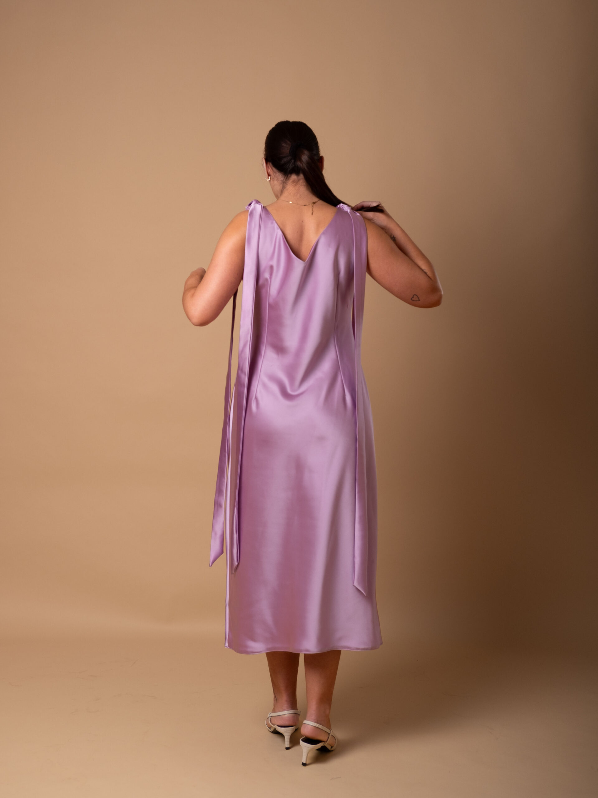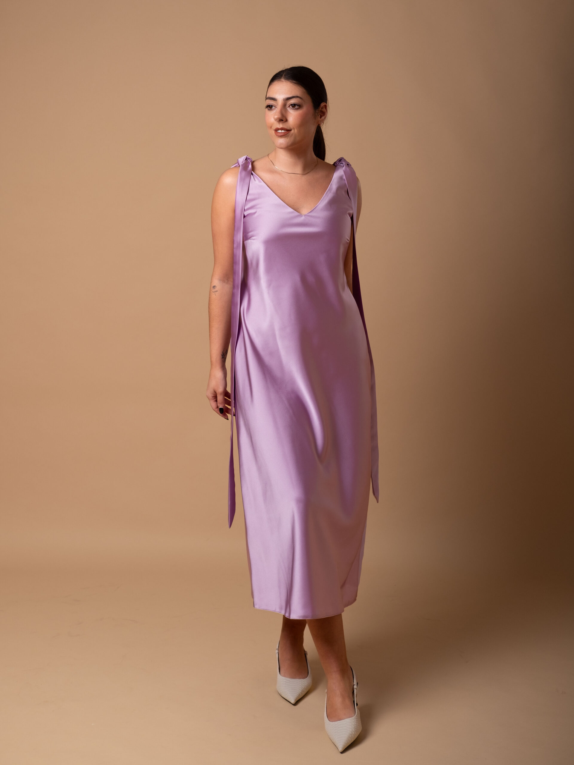 O Vestido Carmen é a definição de elegância discreta e feminina. Confeccionado num tecido acetinado de toque suave e brilho subtil, este vestido midi em tom lavanda destaca-se pela sua fluidez natural e pelo cair leve que acompanha o movimento do corpo com sofisticação.